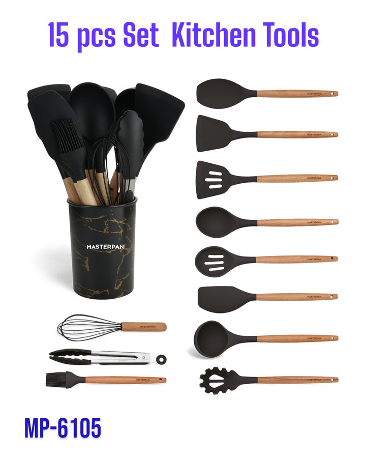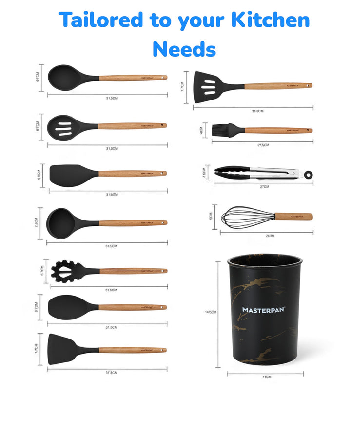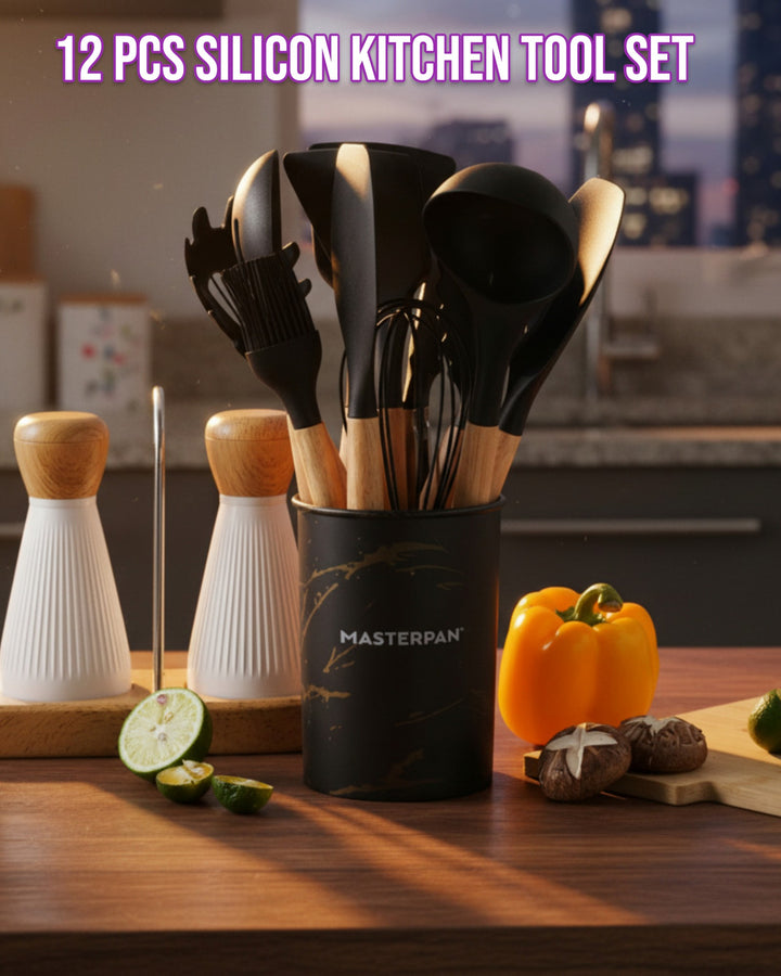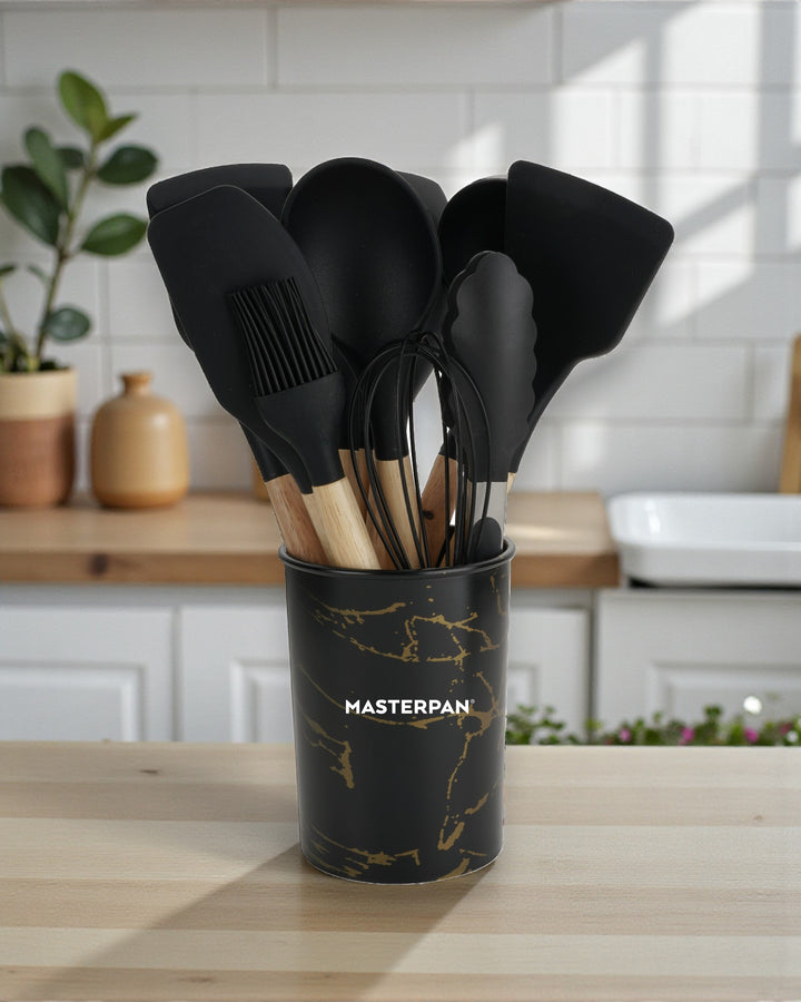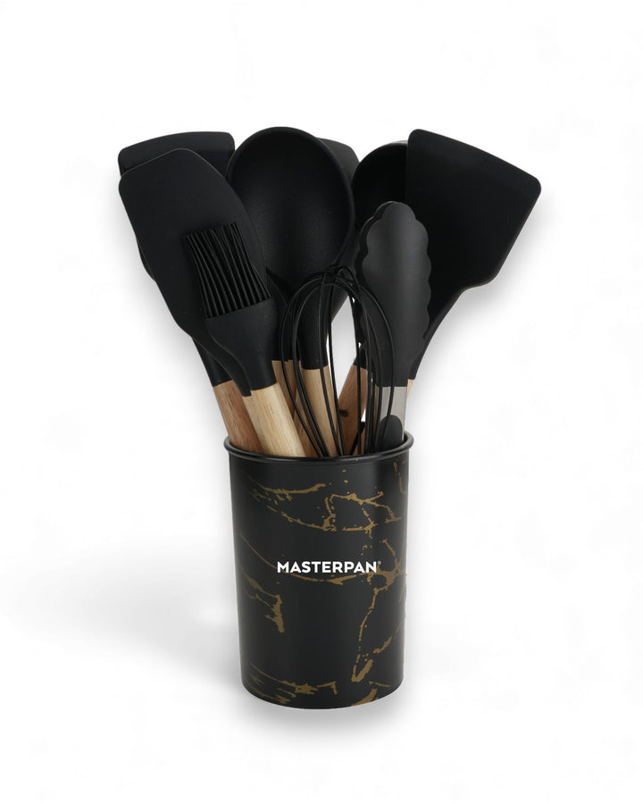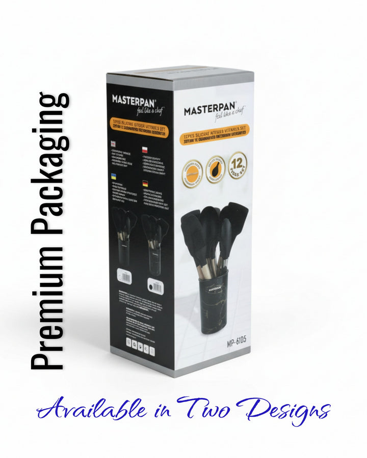 Wir präsentieren das 12-teilige Silikon-Werkzeugset von Masterpan, eine vielseitige und umfassende Sammlung von Küchenutensilien, die Ihr Kocherlebnis verbessern sollen. Dieses Set enthält 12 hochwertige Werkzeuge in elegantem Schwarz, jedes mit Griffen aus Gummiholz ​​für Komfort und Haltbarkeit. Das Set wird mit einem Ständer geliefert, der mit dem Masterpan-Logo verziert ist und sich zur praktischen Aufbewahrung und Präsentation eignet. Dieses Set ist in einer Farbbox verpackt und eine perfekte Ergänzung für Ihre Küchenutensilien.