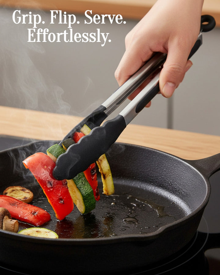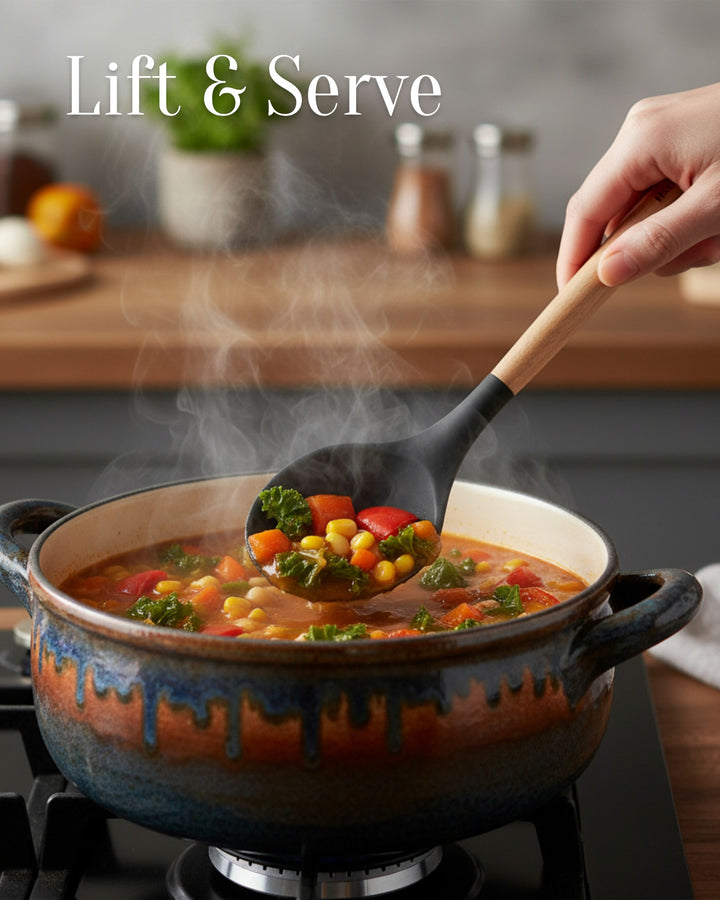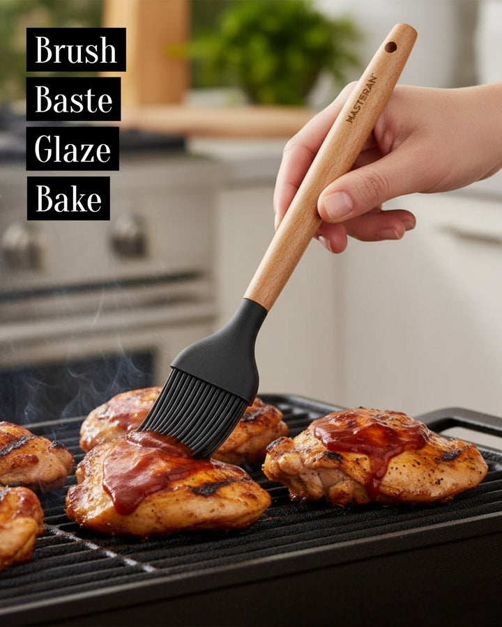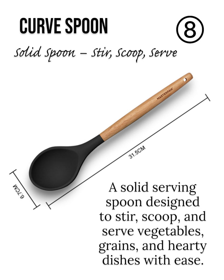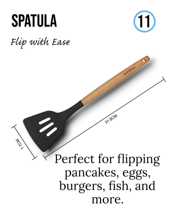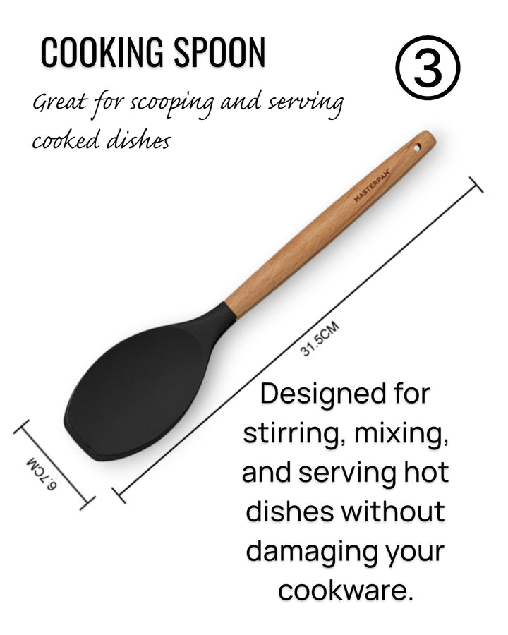 Wir präsentieren das 12-teilige Silikon-Werkzeugset von Masterpan, eine vielseitige und umfassende Sammlung von Küchenutensilien, die Ihr Kocherlebnis verbessern sollen. Dieses Set enthält 12 hochwertige Werkzeuge in elegantem Schwarz, jedes mit Griffen aus Gummiholz ​​für Komfort und Haltbarkeit. Das Set wird mit einem Ständer geliefert, der mit dem Masterpan-Logo verziert ist und sich zur praktischen Aufbewahrung und Präsentation eignet. Dieses Set ist in einer Farbbox verpackt und eine perfekte Ergänzung für Ihre Küchenutensilien.