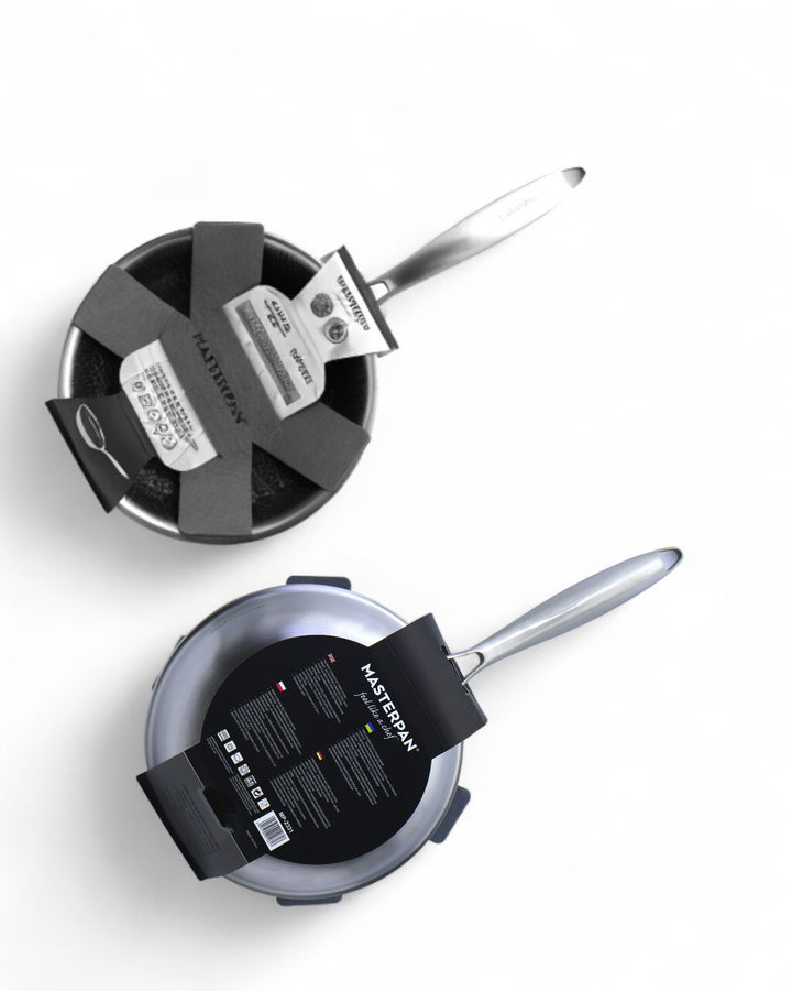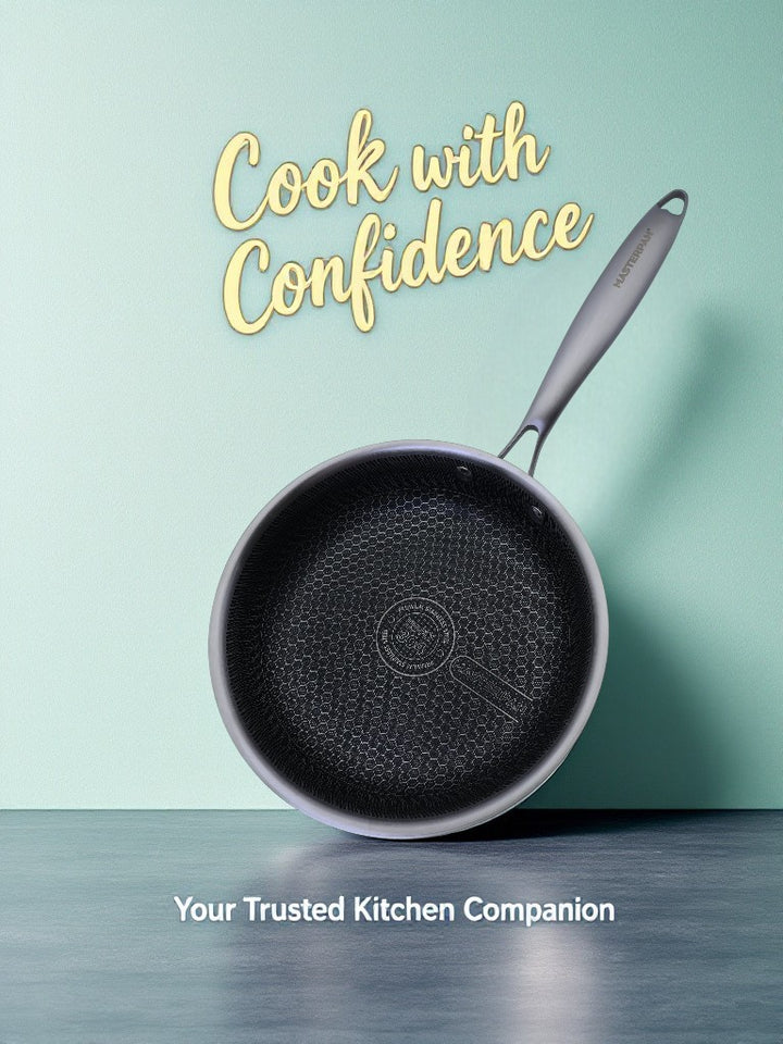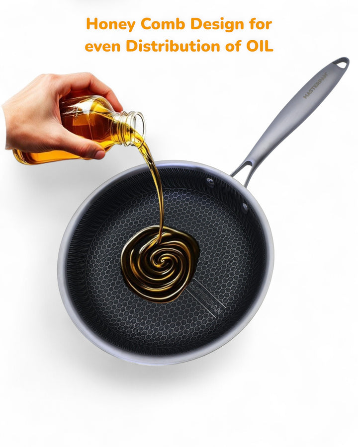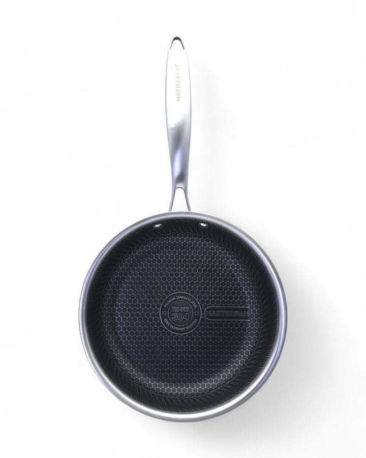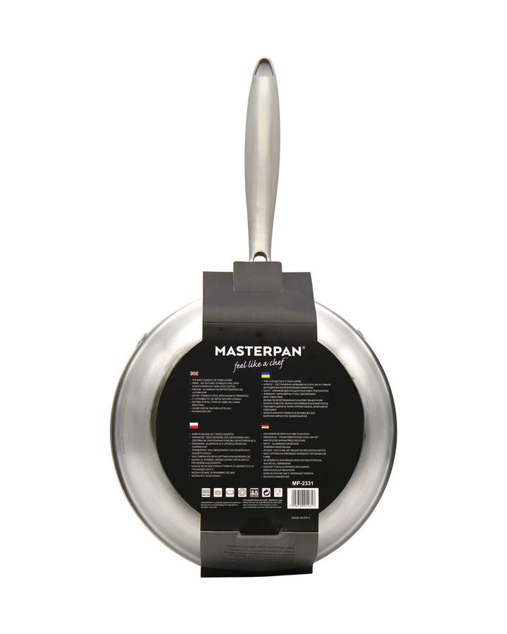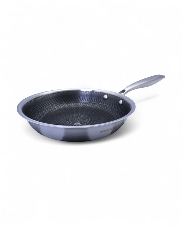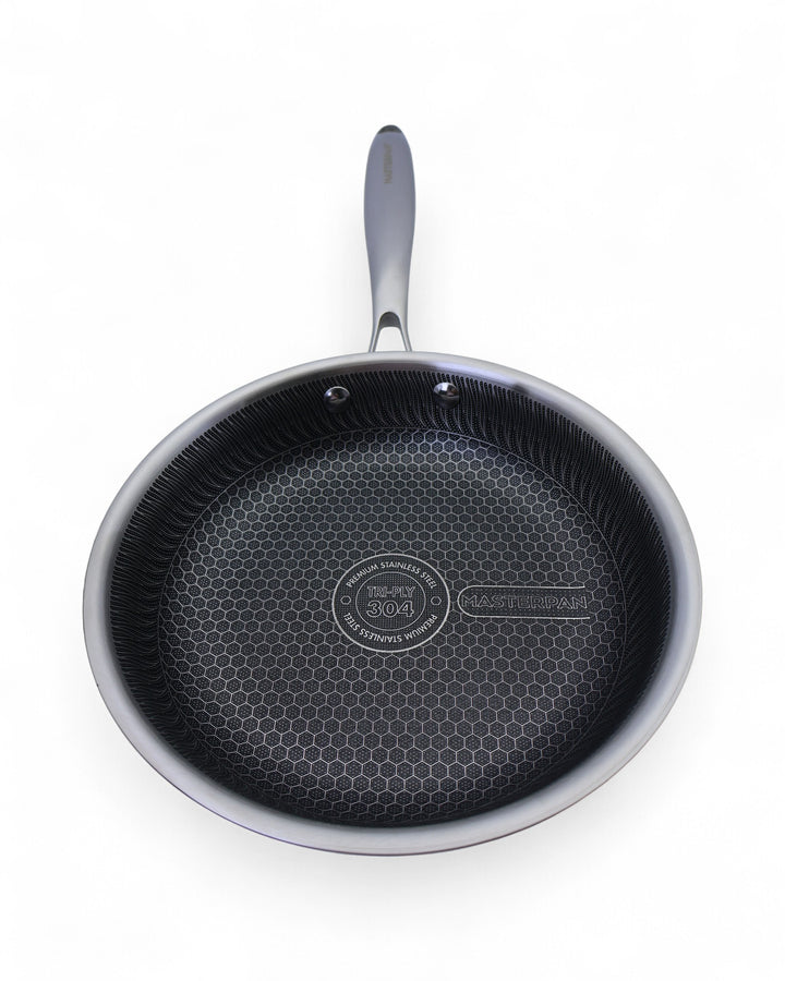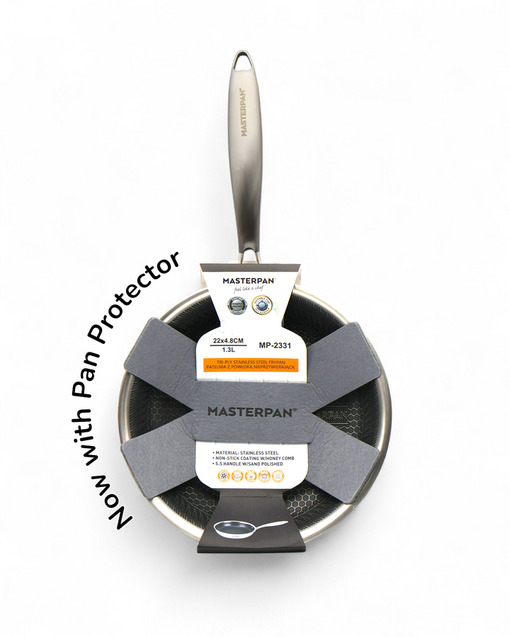 The MASTERPAN Stainless Steel Fry Pan 8.5" (22CM) is a kitchen essential crafted from TRI-PLY S.S with a thickness of 2.5MM. This pan features 2 layers of black non-stick coating with a honeycomb interior and sand polished exterior, making it both stylish and durable. It can be used on any heat source, including induction cooktops, without any worries. The deep 2.5” sides of this pan help prevent spillage and splatter, making it perfect for a variety of dishes like stir frys, crepes, pancakes, eggs, quesadillas, and more. With its sleek style and ultra durability, this pan fulfills all your cooking desires while adding a streamlined look to your kitchen.