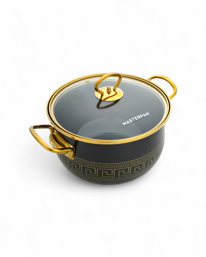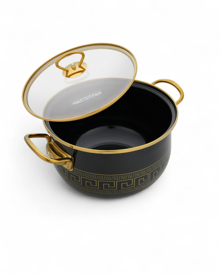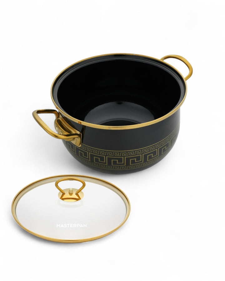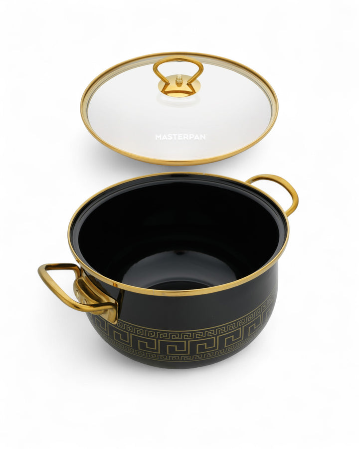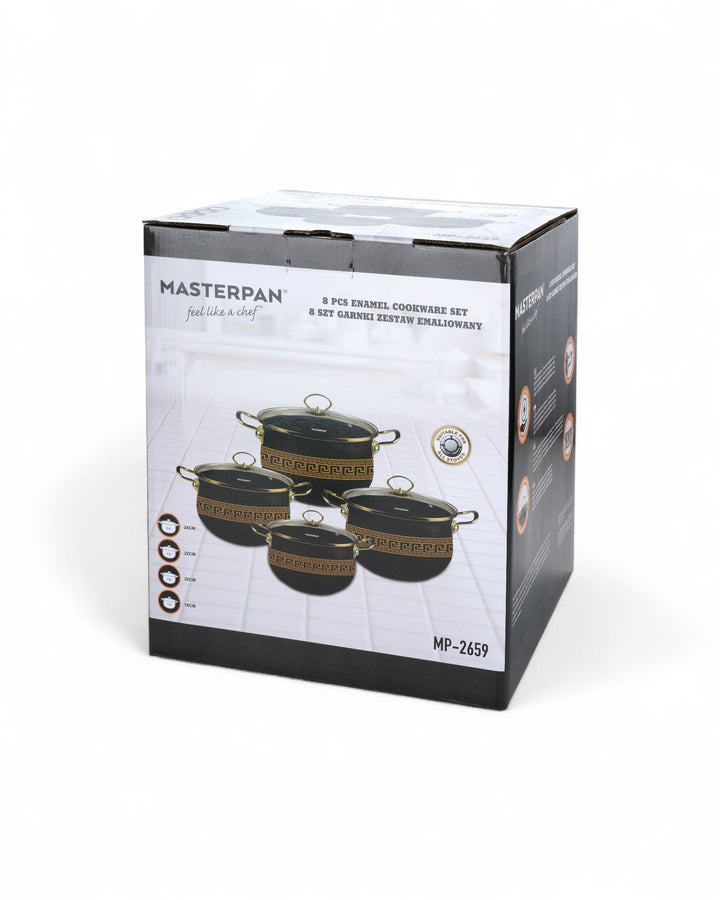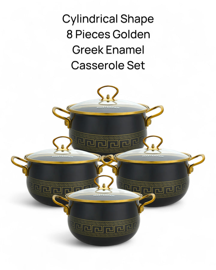 The MASTERPAN 8-Piece Enamel Casserole Set beautifully merges style and functionality for your kitchen. Made from sturdy 0.8mm carbon steel, each casserole boasts an enamel coating on both the inside and outside, ensuring even heat distribution during cooking.
