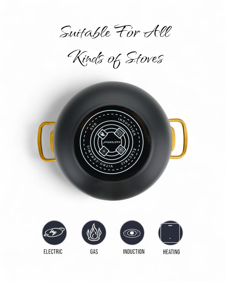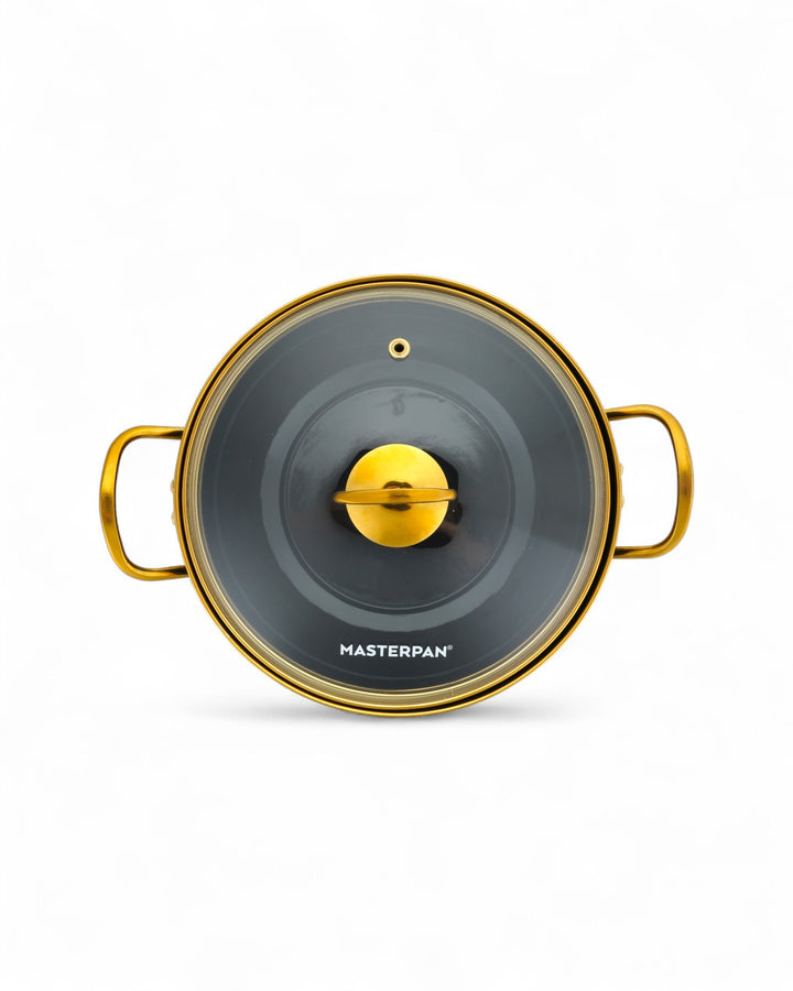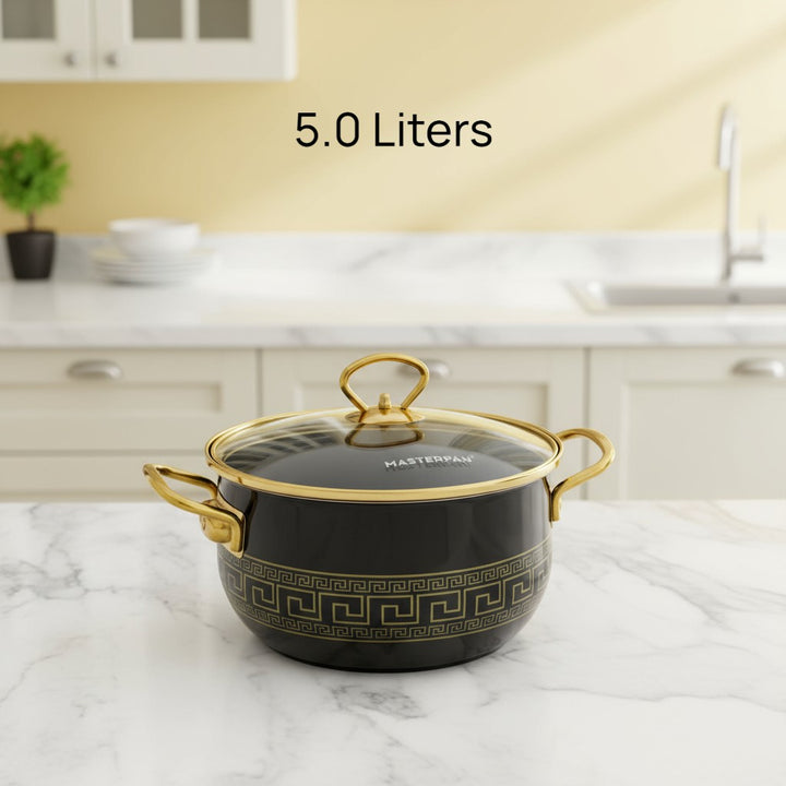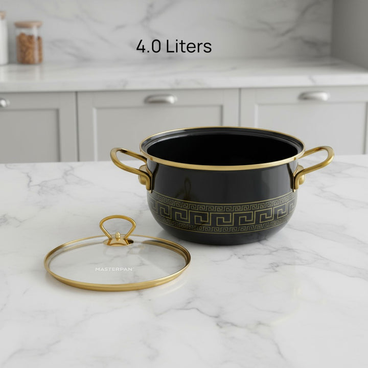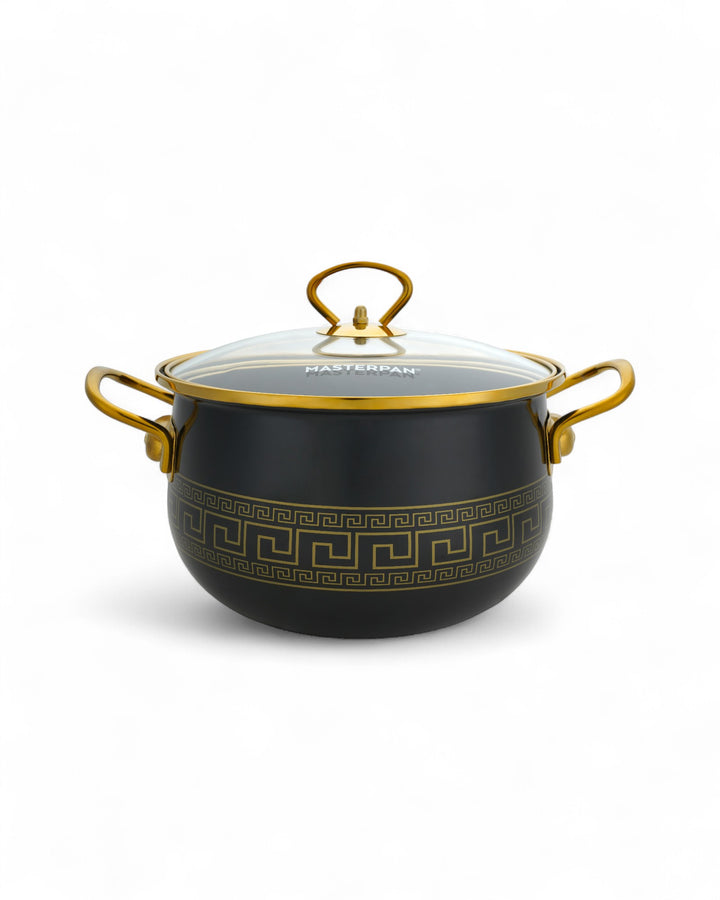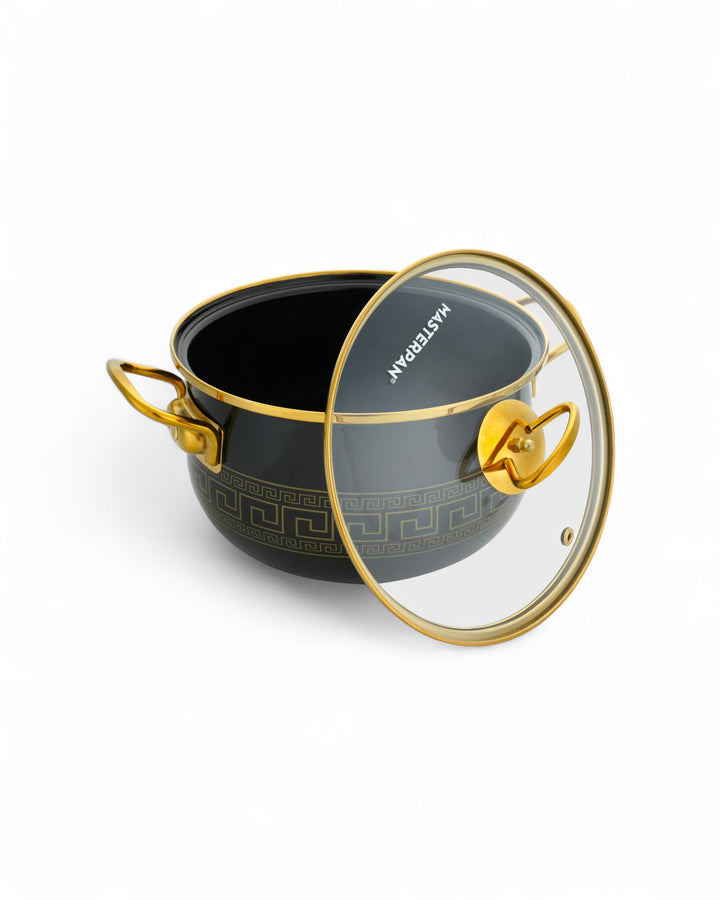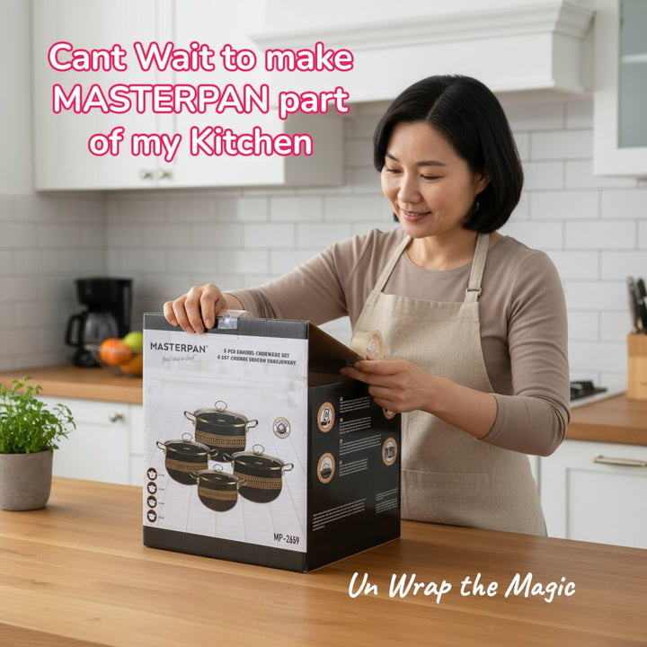 The MASTERPAN 8-Piece Enamel Casserole Set beautifully merges style and functionality for your kitchen. Made from sturdy 0.8mm carbon steel, each casserole boasts an enamel coating on both the inside and outside, ensuring even heat distribution during cooking.
