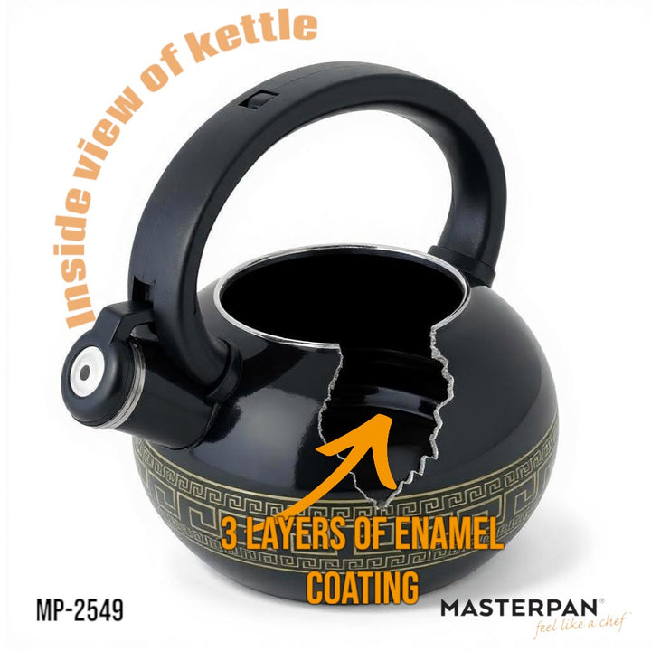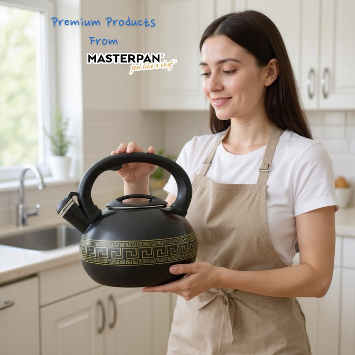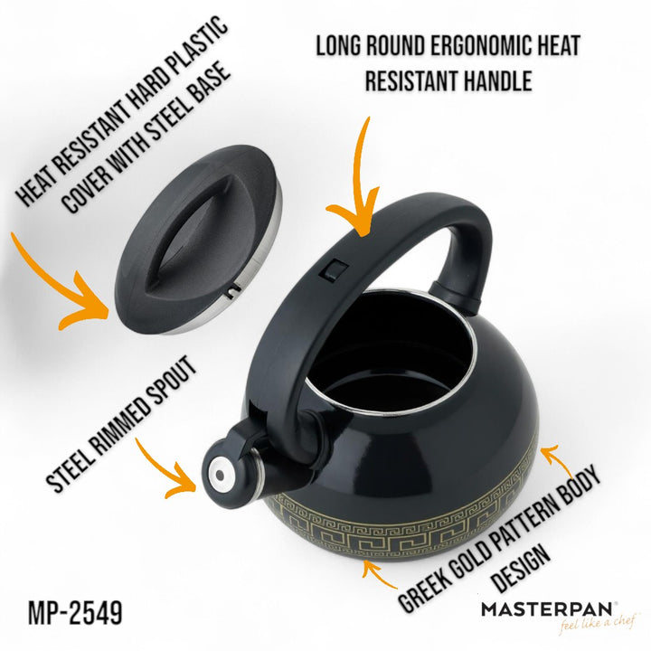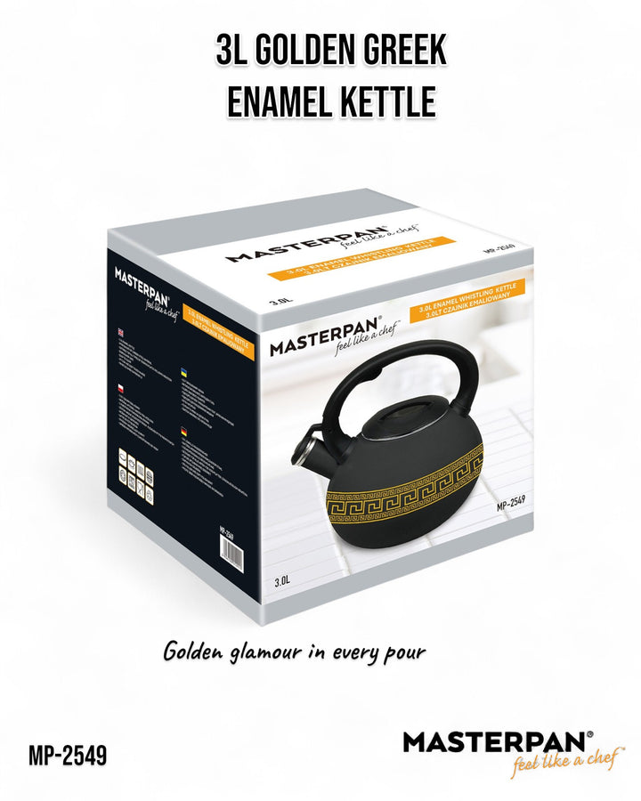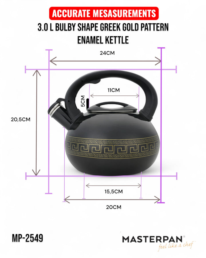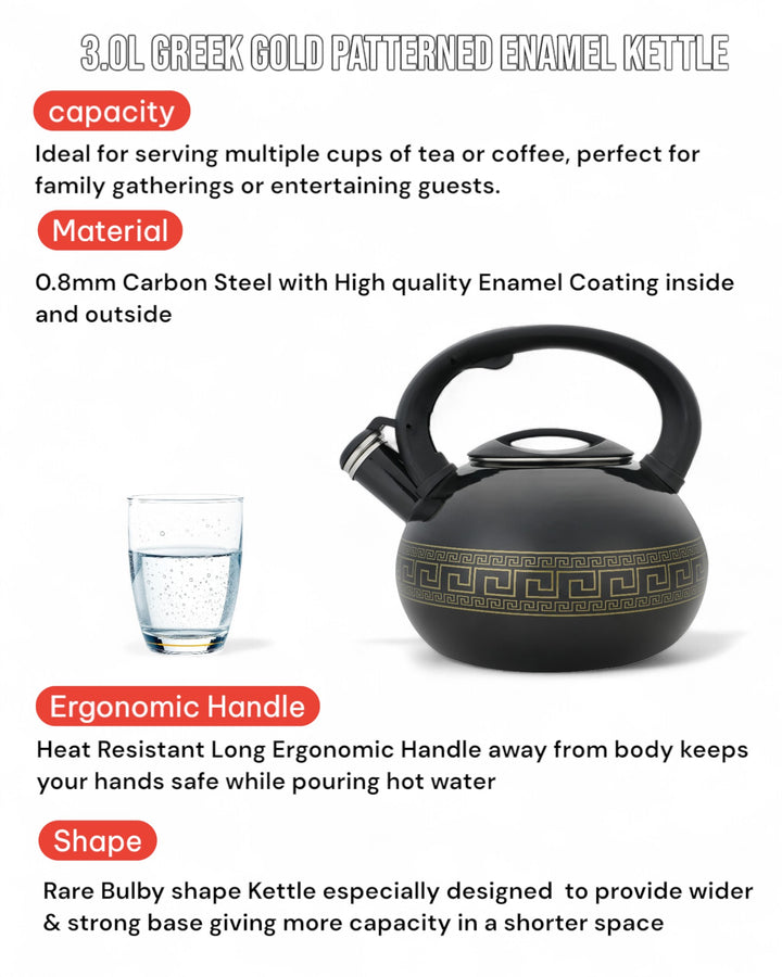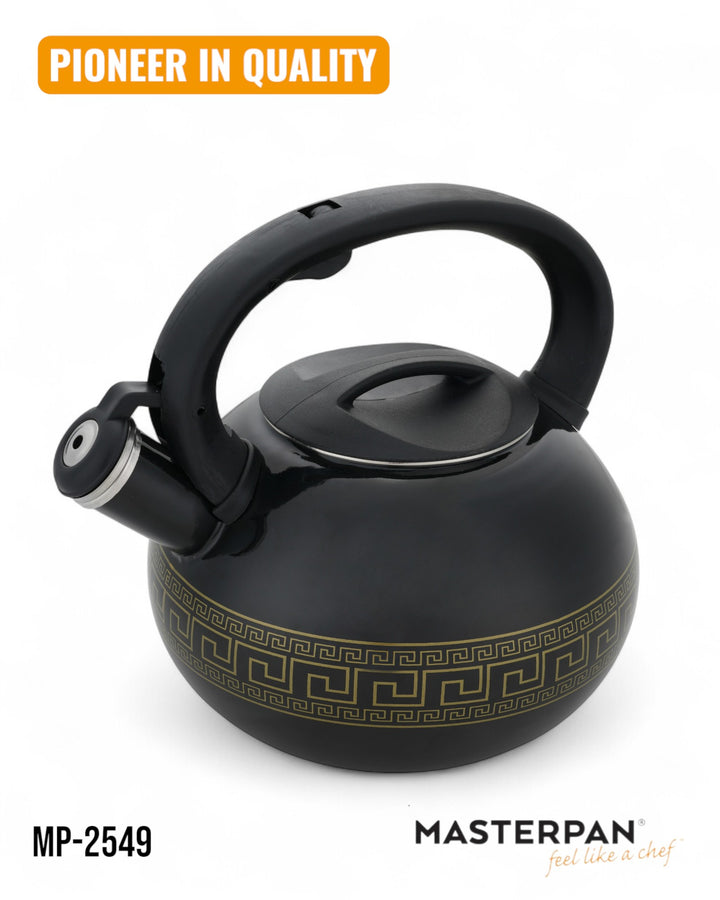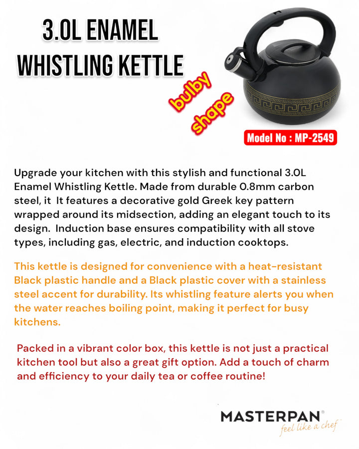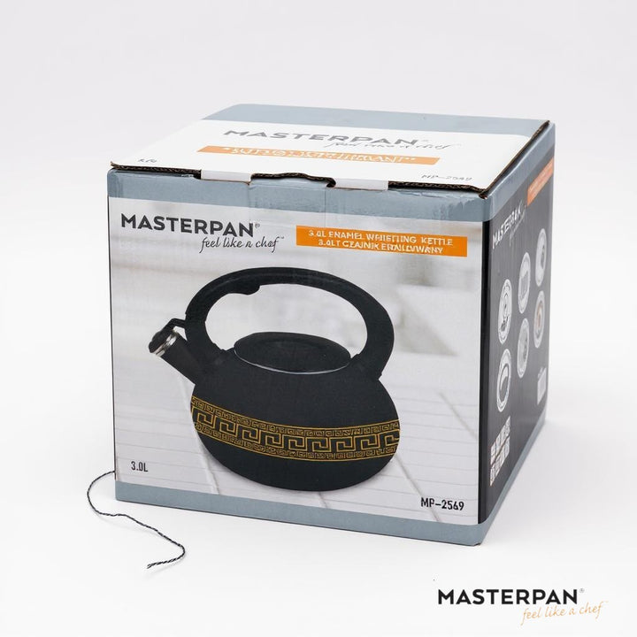 The MASTERPAN 3.0L Enamel Whistling Kettle is a contemporary and stylish addition to any kitchen. Constructed from durable 0.8mm carbon steel, this kettle features a premium enamel coating on both the interior and exterior, ensuring a smooth and resilient surface. The exterior showcases a modern black finish, elegantly accented with striking gold design lines that enhance its sophisticated look.