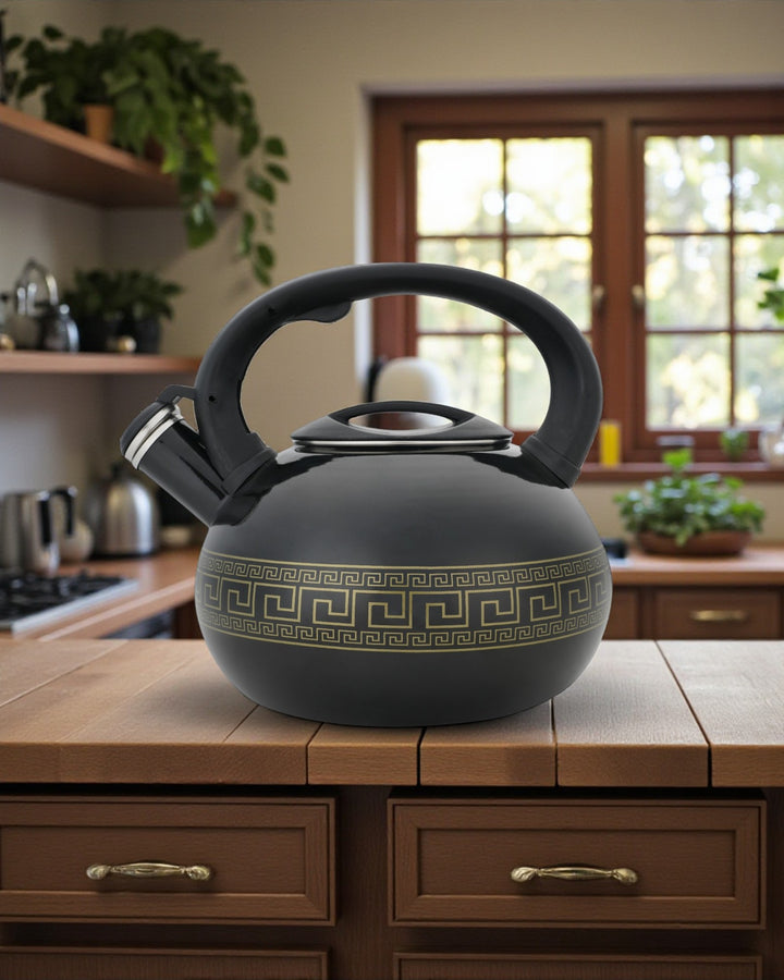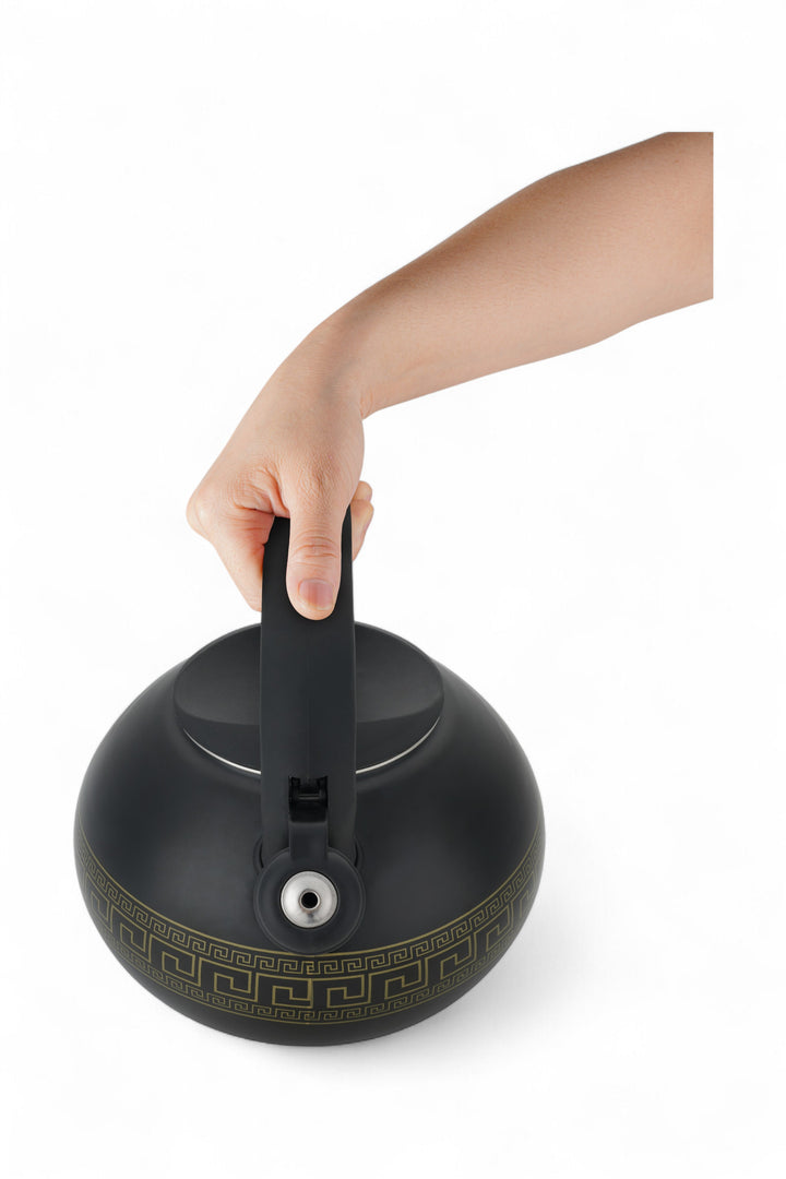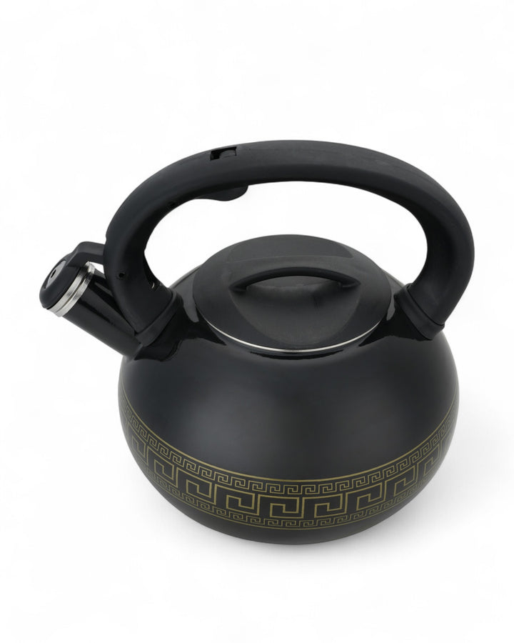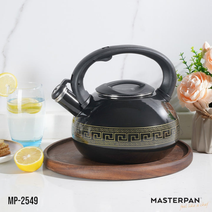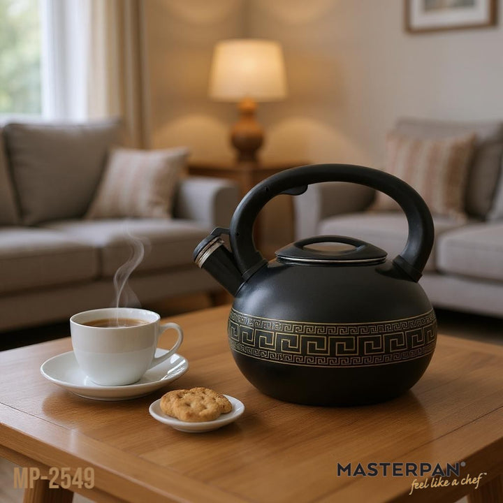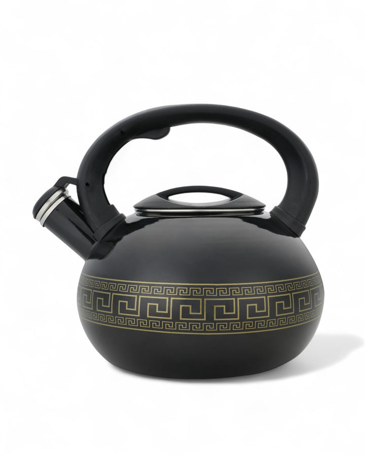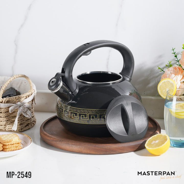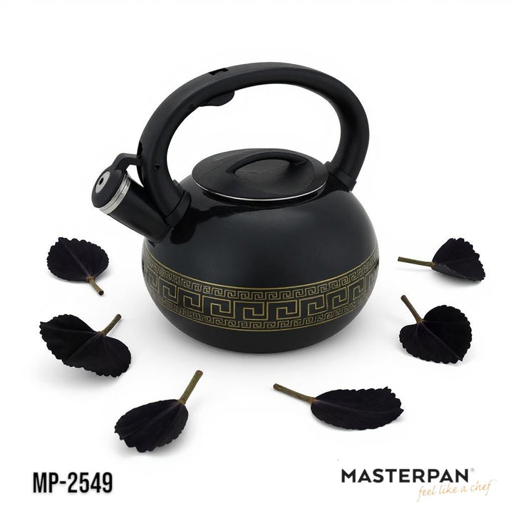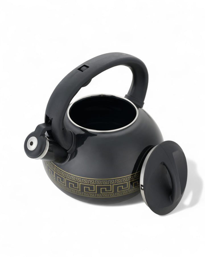 The MASTERPAN 3.0L Enamel Whistling Kettle is a contemporary and stylish addition to any kitchen. Constructed from durable 0.8mm carbon steel, this kettle features a premium enamel coating on both the interior and exterior, ensuring a smooth and resilient surface. The exterior showcases a modern black finish, elegantly accented with striking gold design lines that enhance its sophisticated look.