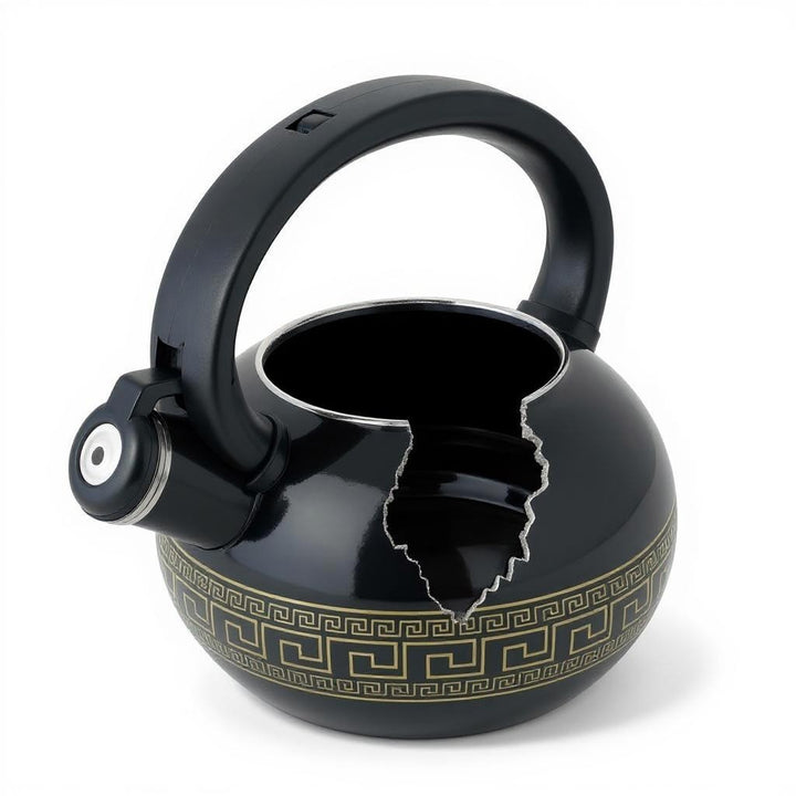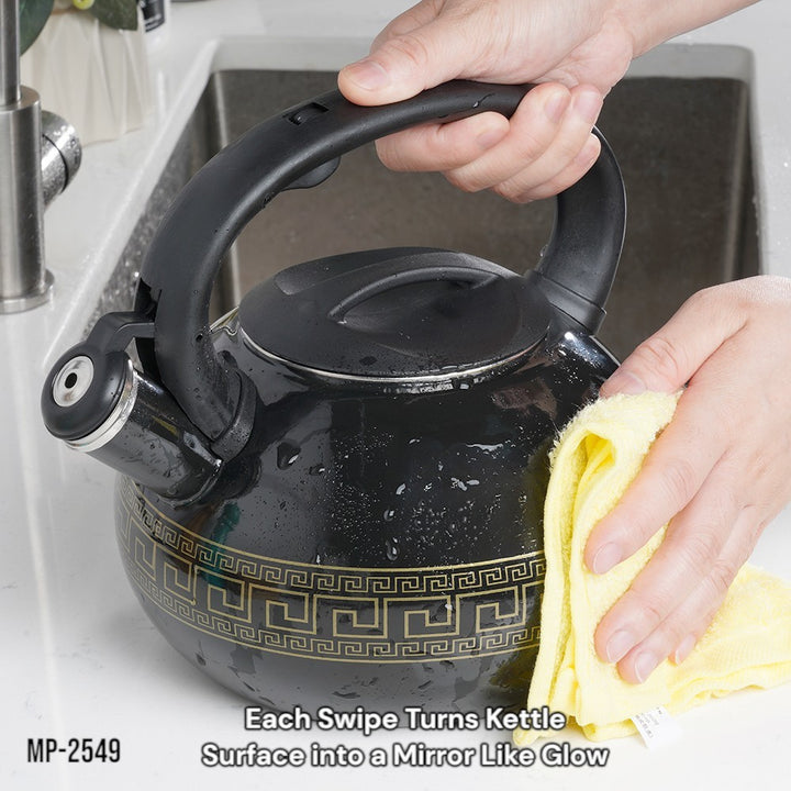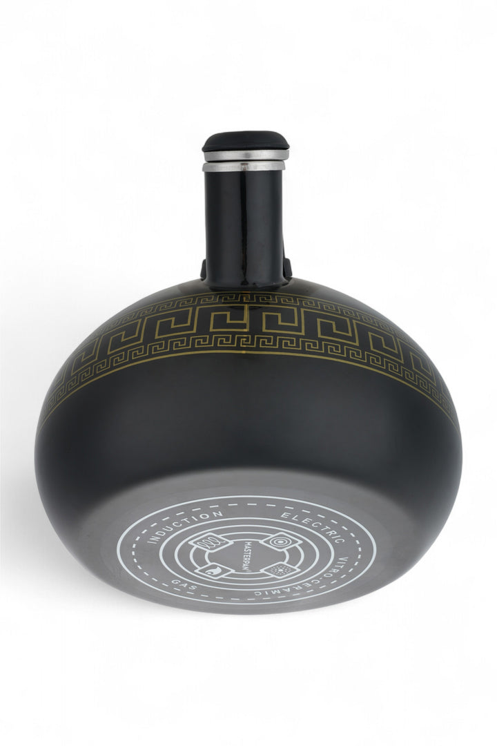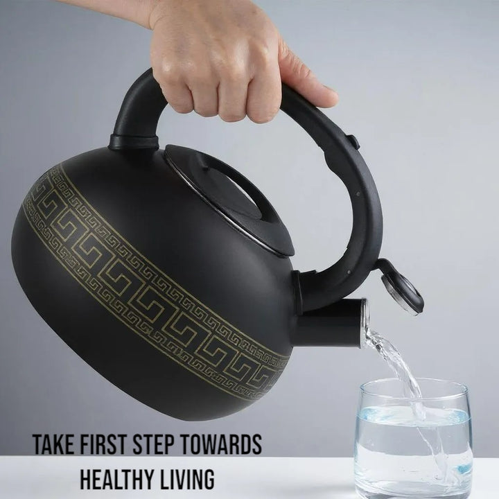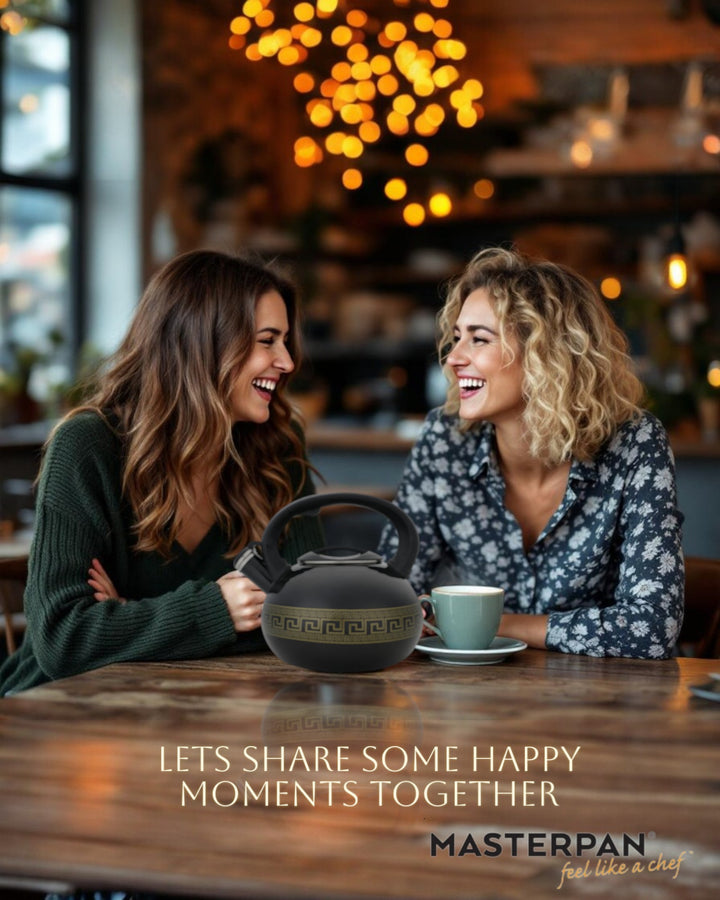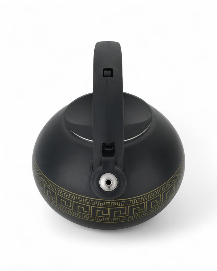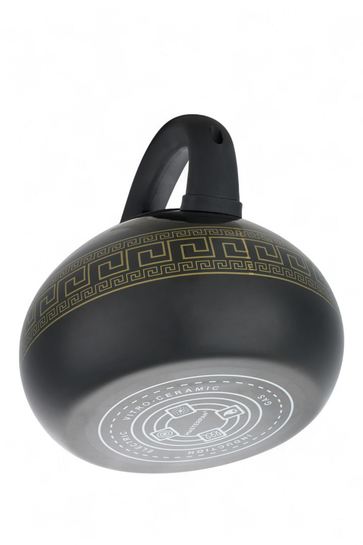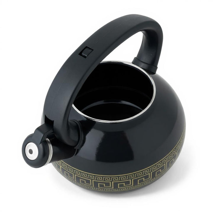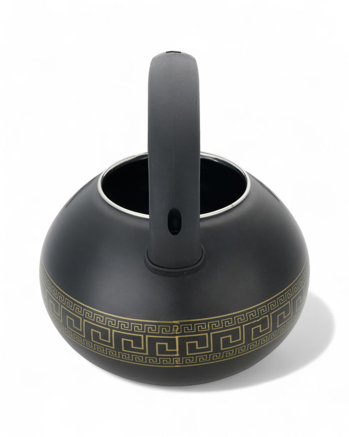 The MASTERPAN 3.0L Enamel Whistling Kettle is a contemporary and stylish addition to any kitchen. Constructed from durable 0.8mm carbon steel, this kettle features a premium enamel coating on both the interior and exterior, ensuring a smooth and resilient surface. The exterior showcases a modern black finish, elegantly accented with striking gold design lines that enhance its sophisticated look.