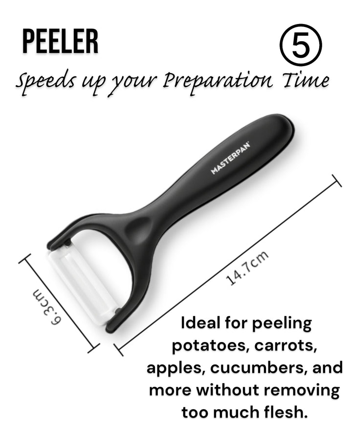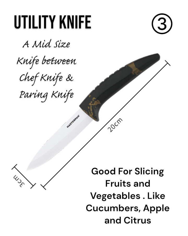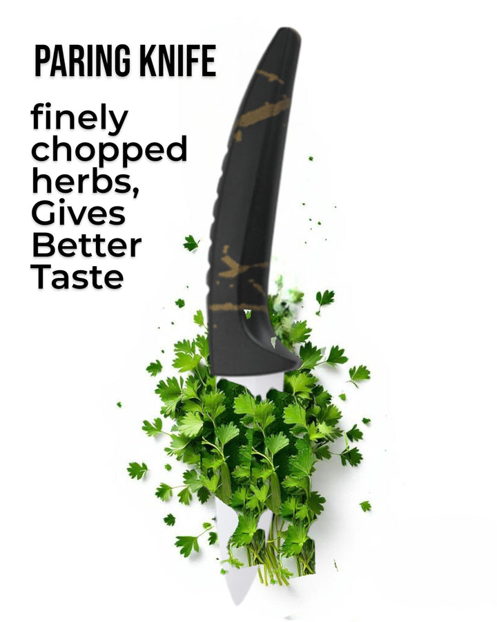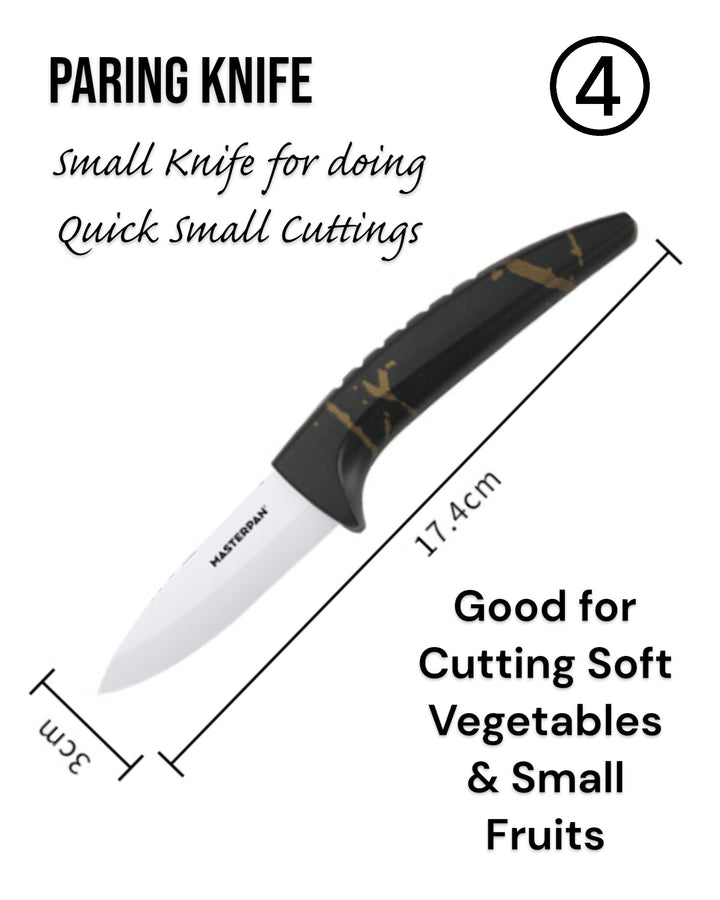 - 3" Paring Knife – For detailed cutting and peeling PP Peeler – With a sharp ceramic blade for easy peeling