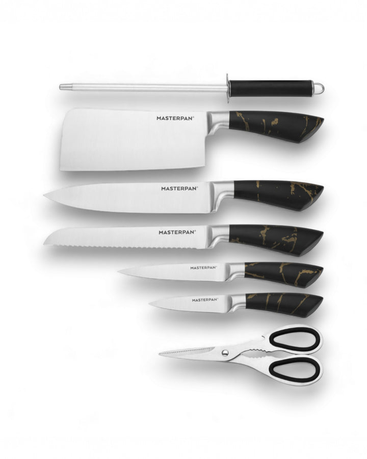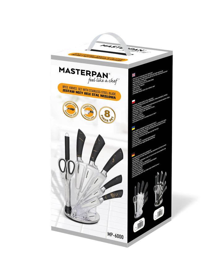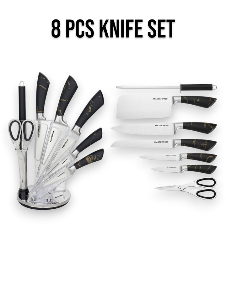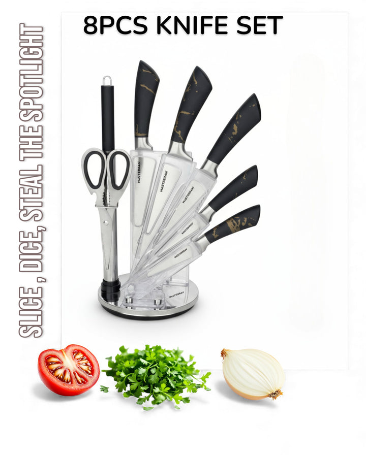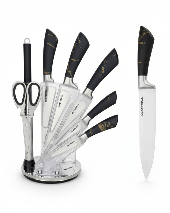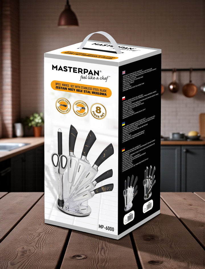 Elevate your kitchen with the Masterpan MP-6000 8-Piece Knife Set. Designed for both professional chefs and home cooks, this premium set combines functionality, precision, and modern style. Each knife features a durable 3Cr13 stainless steel blade with a sanding polish finish, ensuring long-lasting sharpness and effortless cutting performance. The sleek hollow handles (customizable design) offer a comfortable grip, perfectly balancing elegance and practicality.