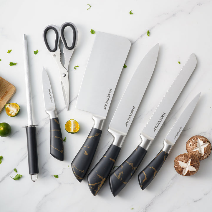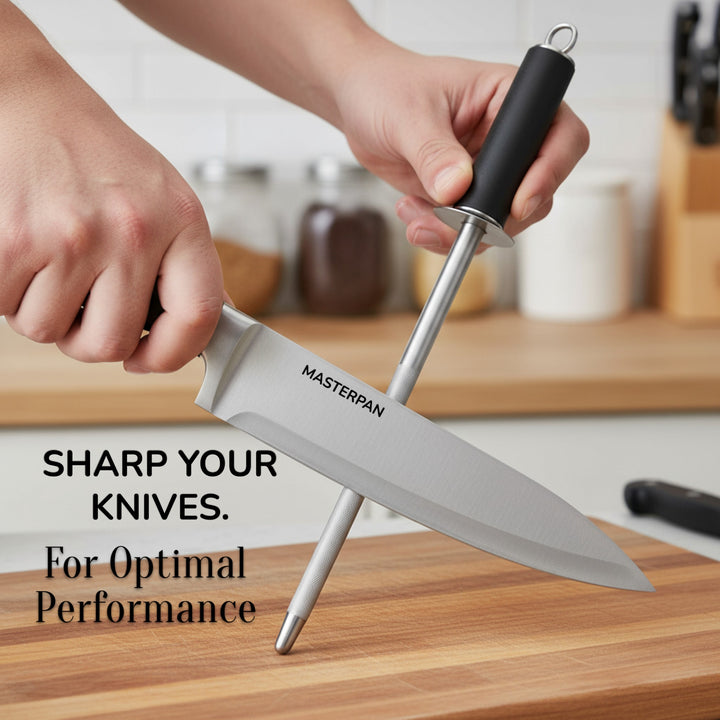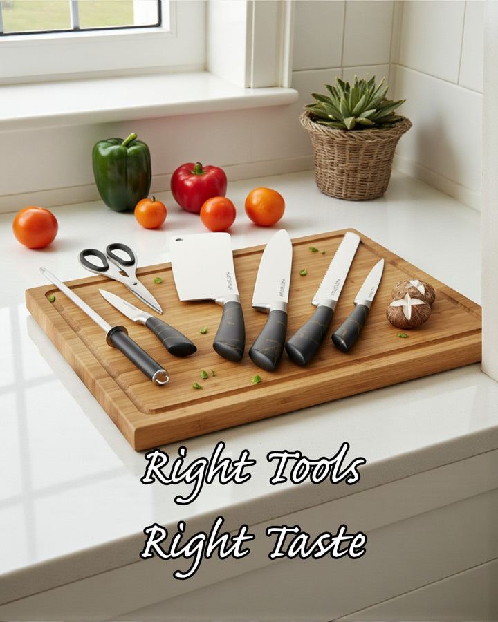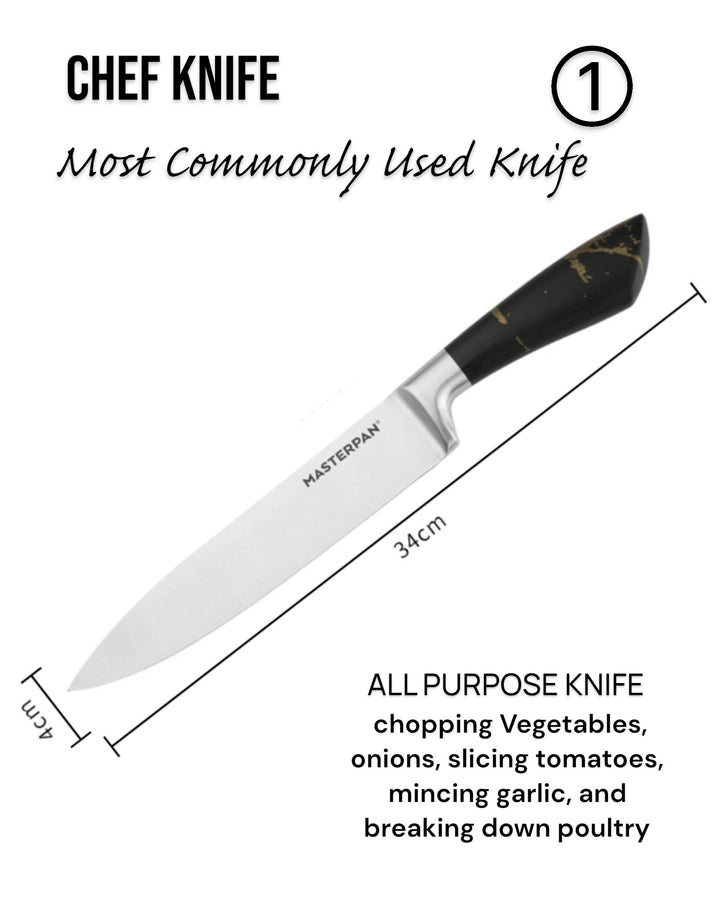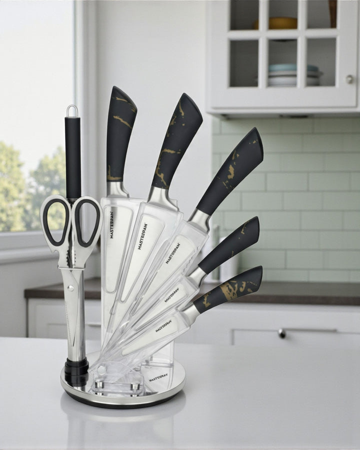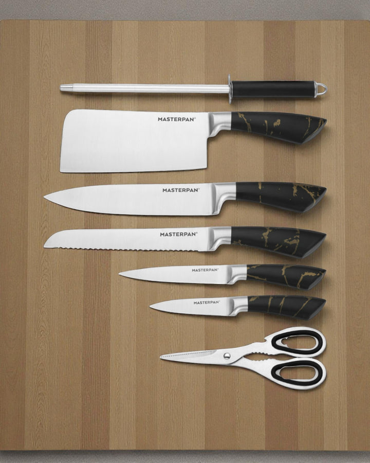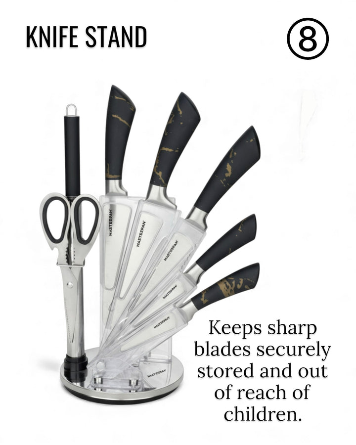 Elevate your kitchen with the Masterpan MP-6000 8-Piece Knife Set. Designed for both professional chefs and home cooks, this premium set combines functionality, precision, and modern style. Each knife features a durable 3Cr13 stainless steel blade with a sanding polish finish, ensuring long-lasting sharpness and effortless cutting performance. The sleek hollow handles (customizable design) offer a comfortable grip, perfectly balancing elegance and practicality.