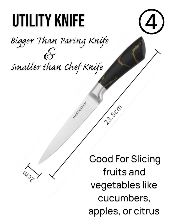 - 5" Utility Knife: 1.8mm blade for versatile everyday kitchen tasks.