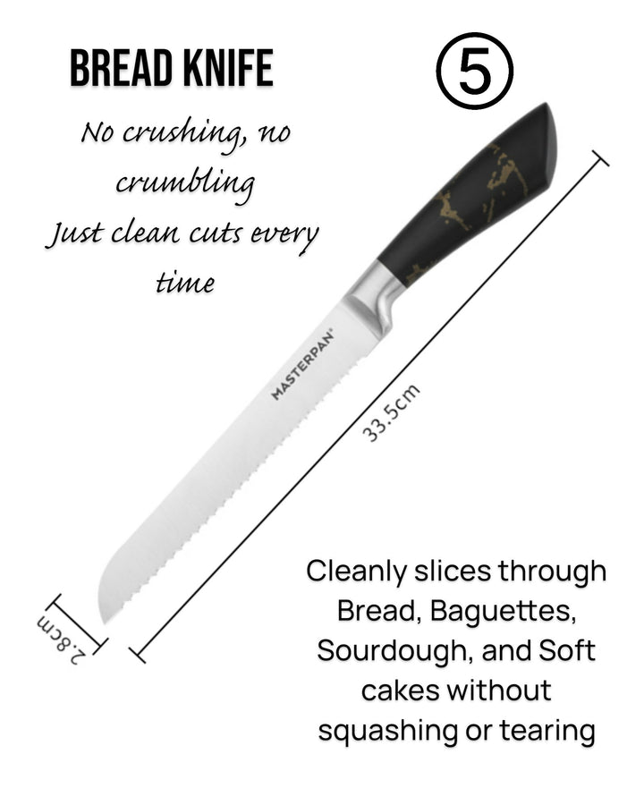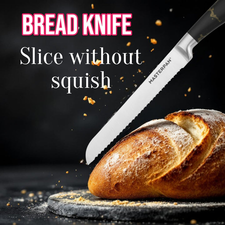 - 8" Bread Knife: 2.0mm serrated blade for clean cuts through bread and pastries.