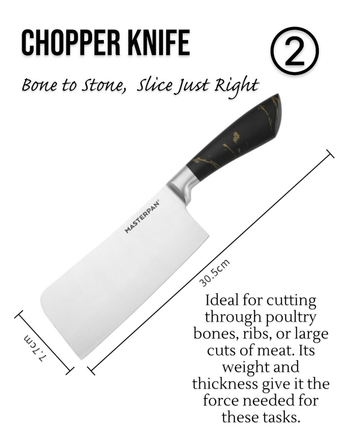 - 6.5" Chopper Knife: 2.0mm blade for effortless chopping and dicing.