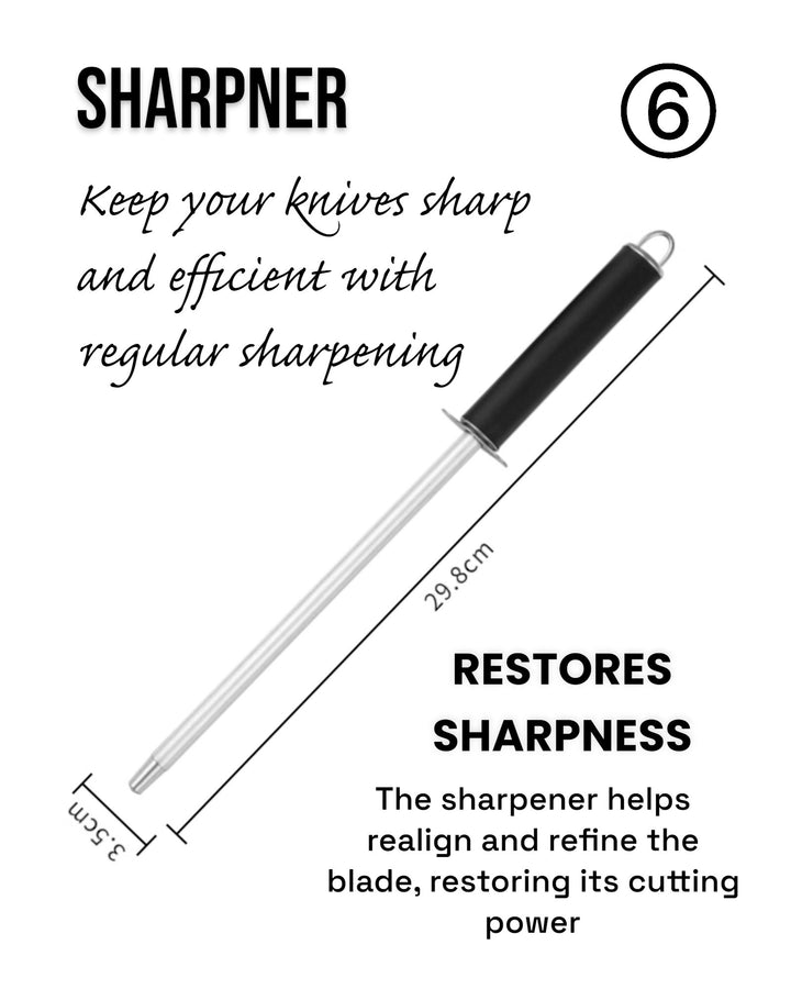 - Sharpener (30cm): Keeps your blades razor-sharp and ready for use.