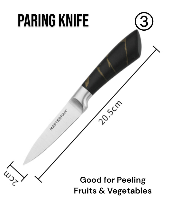 - 3.5" Paring Knife: 1.8mm blade for fine, detailed cutting and peeling.