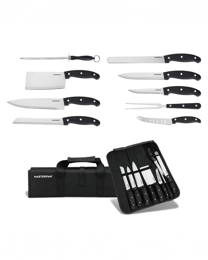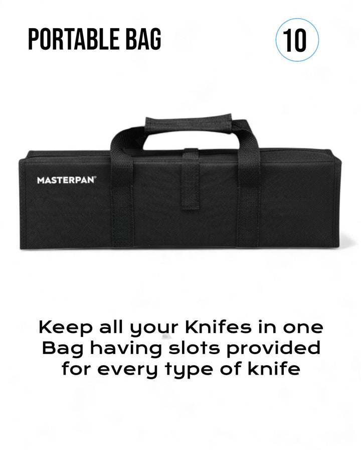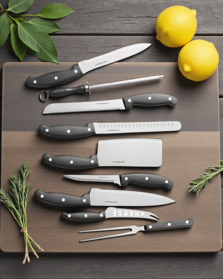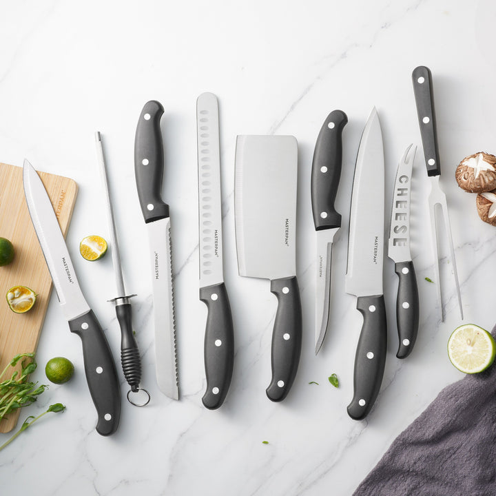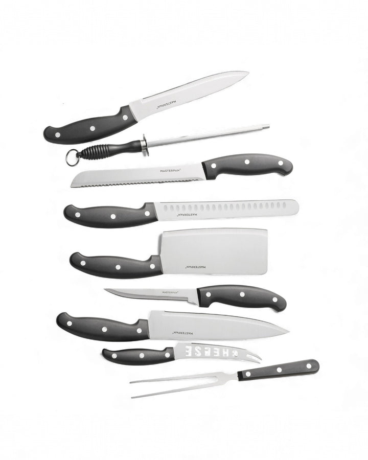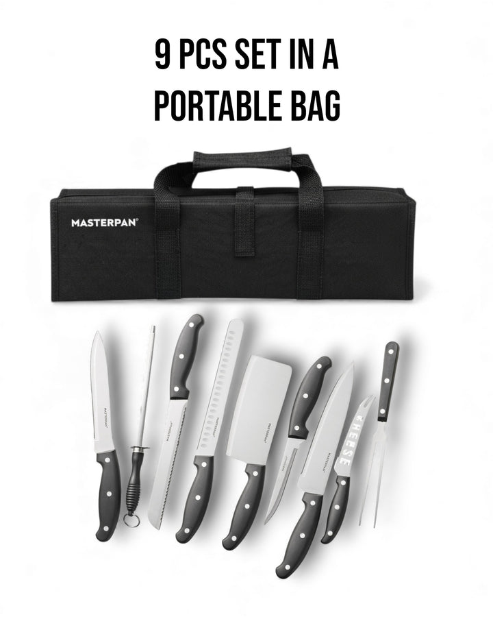 Bring professional quality to your kitchen with the Masterpan MP-6052 9-Piece Knife Set. Each piece is crafted for performance and precision, featuring stainless steel blades and PP handles with a stylish wood-coated finish for a comfortable, natural grip. Perfect for chefs and home cooks alike, this versatile set has every knife you need for slicing, chopping, carving, and more.