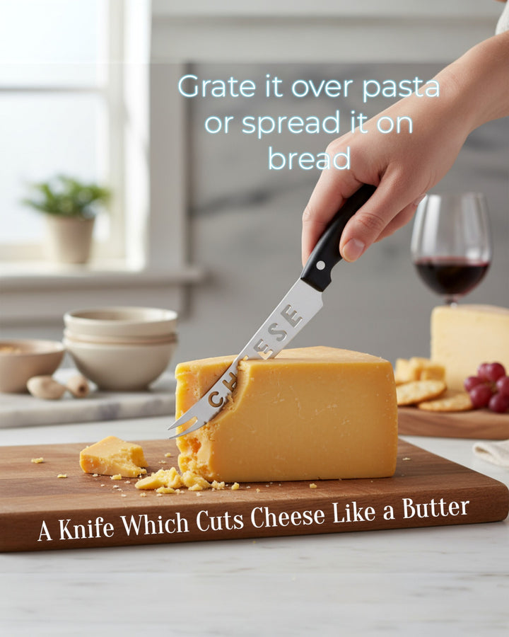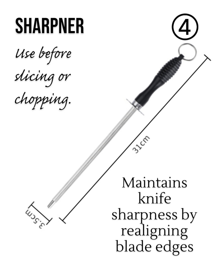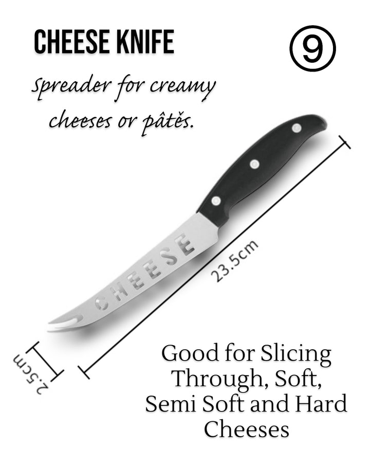 - 5" Cheese Knife – Designed for smooth cheese slicing 9" Sharpener – Keeps your blades in top condition