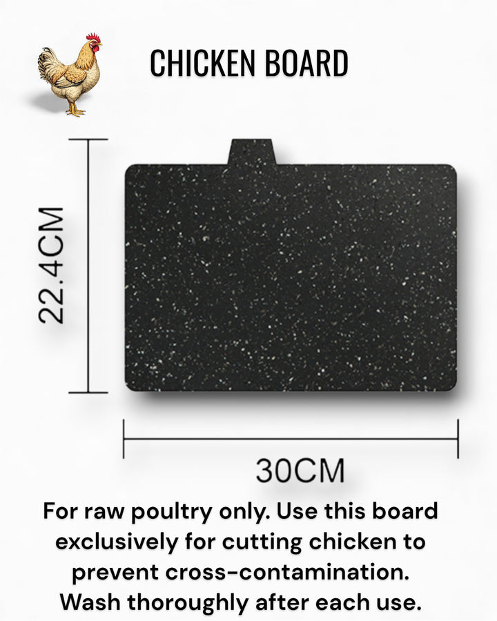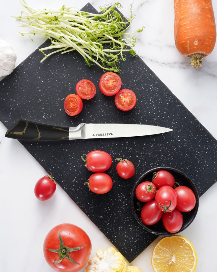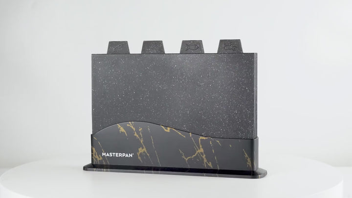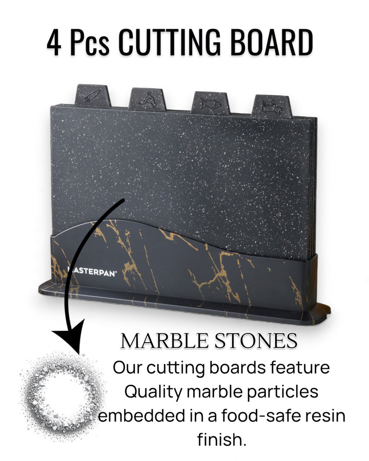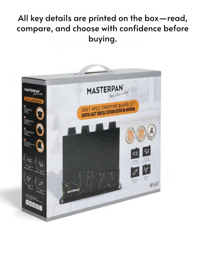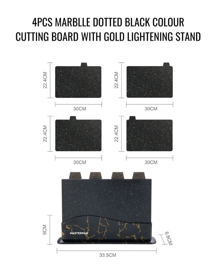 Upgrade your kitchen prep with the Masterpan Cutting Board Set – MP-6067. This stylish set includes four PP cutting boards in sleek black with marble dots, offering both durability and a touch of elegance. Each board measures 30 x 20 x 0.5 cm and weighs 273.8 g, making them lightweight yet sturdy for all your chopping and slicing needs.