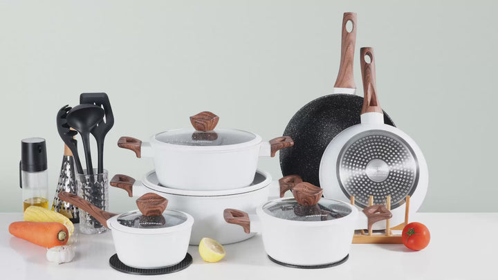 Upgrade your kitchen with the Masterpan 15-Piece Cookware Set – MP-7002, featuring a sleek white design. Crafted from forged aluminium, this set ensures superior strength, even heat distribution, and long-lasting durability. Perfect for every cooking style, it combines functionality with modern elegance.