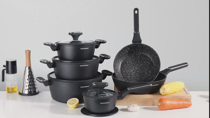 Upgrade your kitchen with the Masterpan 15-Piece Cookware Set – MP-7003, featuring a sleek black design. Crafted from forged aluminium, this set ensures superior strength, even heat distribution, and long-lasting durability. Perfect for every cooking style, it combines functionality with modern elegance.