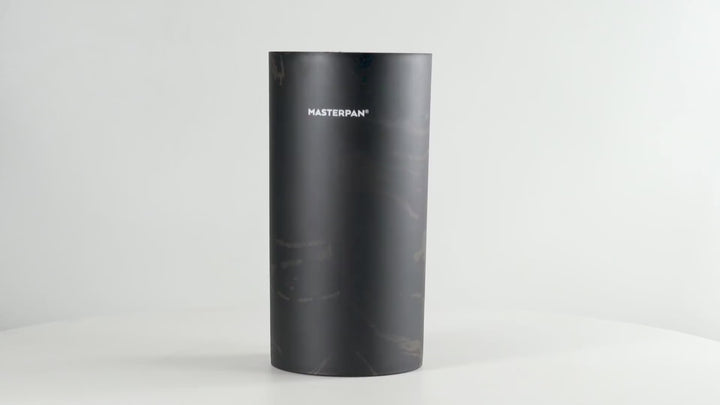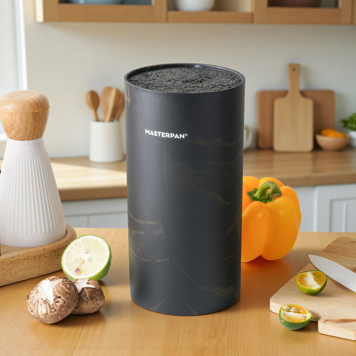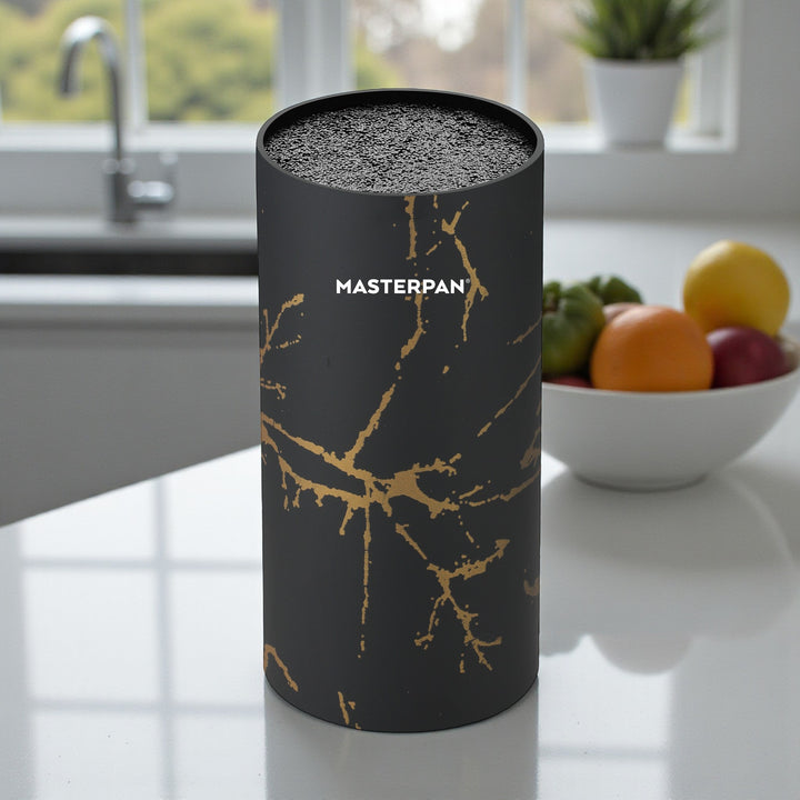 Keep your kitchen knives organized in style with the Masterpan Knife Stand – MP-6070. This elegant stand combines functionality with a modern design, featuring a durable PP construction with a black soft-touch finish for a premium feel. The black silk interior adds a sophisticated touch, while the coated stand design ensures durability and effortless cleaning.