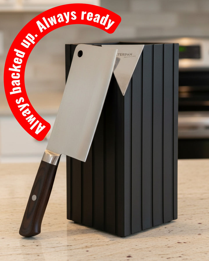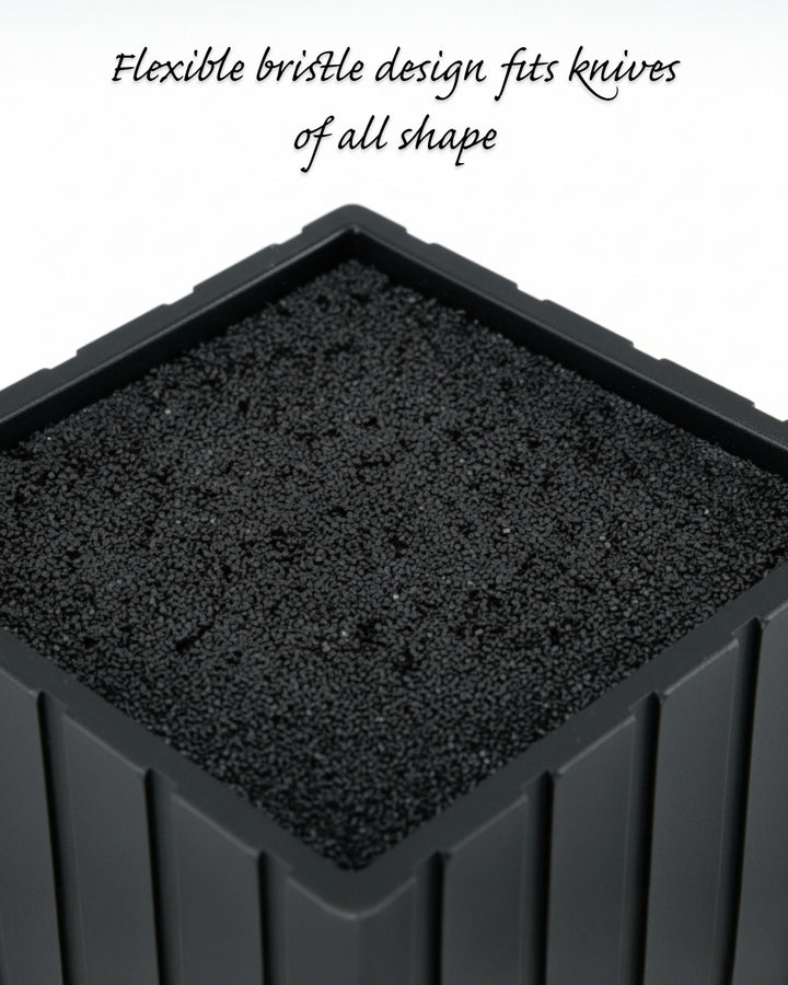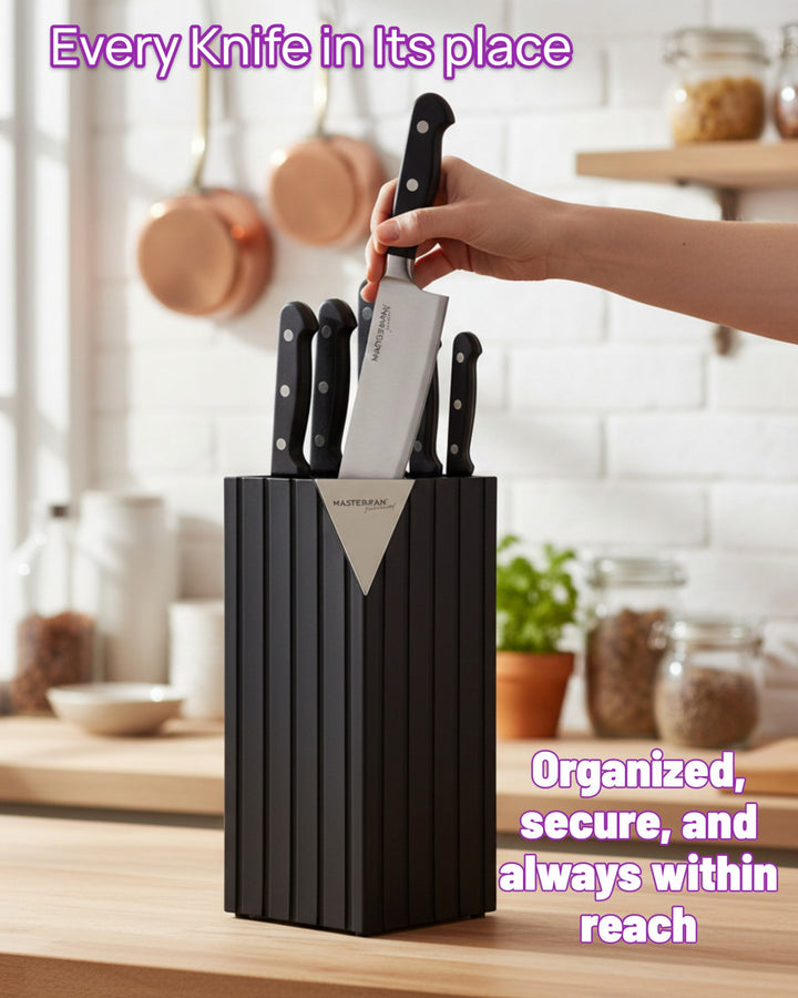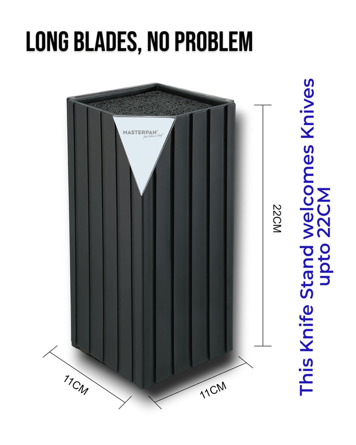 Enhance your kitchen with the Masterpan Knife Set featuring a Rubble Stand in sleek black. This set includes knives with PP handles in a classic black color, paired with a Rubble Stand featuring a black silk interior for stylish storage. Measuring 22cm, this set is packaged in a color box, making it a perfect addition to your culinary arsenal.