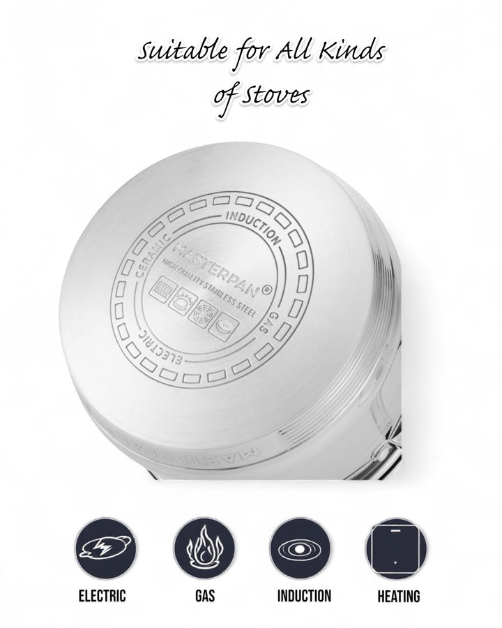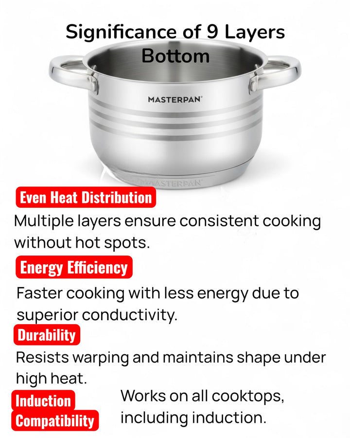 The innovative 9-layer bottom combines 0.5 mm aluminum and 2.5 mm iron, optimized for rapid and even heat distribution. This set is compatible with all cooking surfaces, including induction, thanks to its advanced 430 induction bottom base.